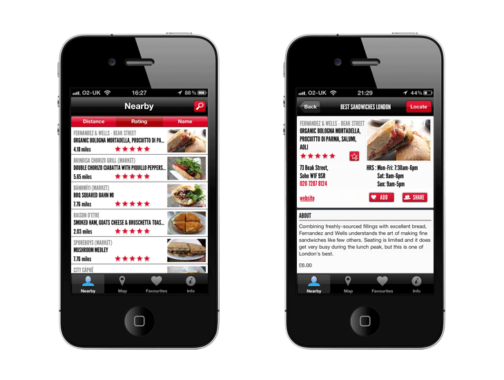 - Intuitive navigation and the ability to locate and sort sandwiches by distance, rating and name.